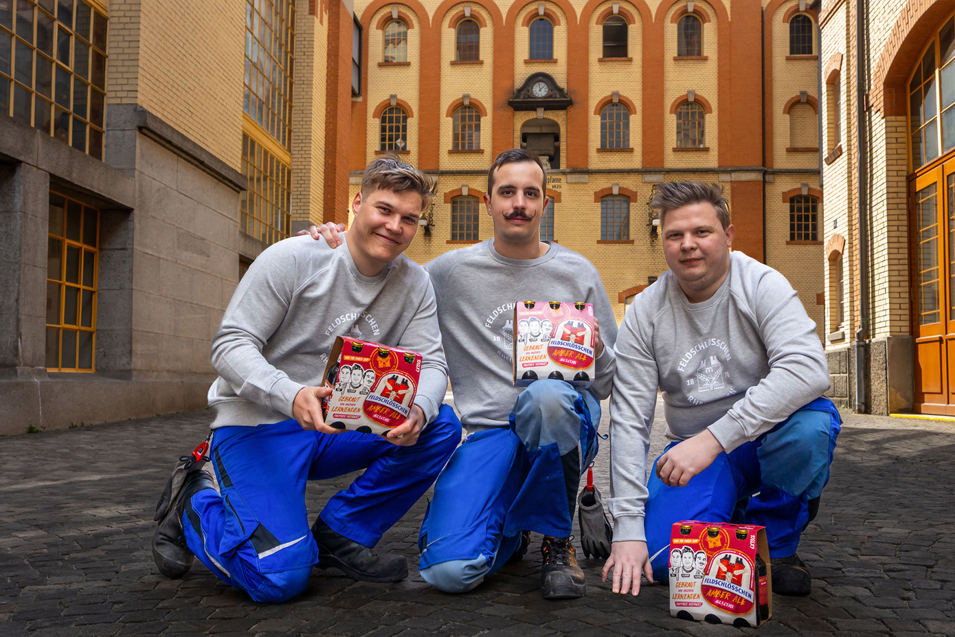 Feldschlösschen-Lernenden Florian, Thomas und Till. Bereits zum siebten Mal wurde dieses Projekt durchgeführt. Der Erlös des Bieres kommt vollumfänglich dem Ausbildungsfonds für Lernende zugute. Darüber hinaus schenkt das Projekt angehenden Brauerinnen und Brauern die Möglichkeit, ihre ganz persönliche Bierkreation zu erschaffen – von der ersten inspirierenden Idee bis zur Etikette. Der Name des Biers ist eine Hommage an das Brauereifohlen Amber, das im Vorjahr im Schloss-Stall zur Welt kam.